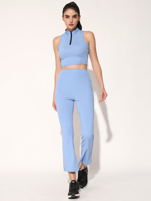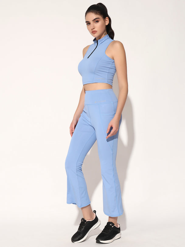 NYLON WOMEN WORKOUT FLARE PANT WITH ZIPED TOP - SKY BLUE