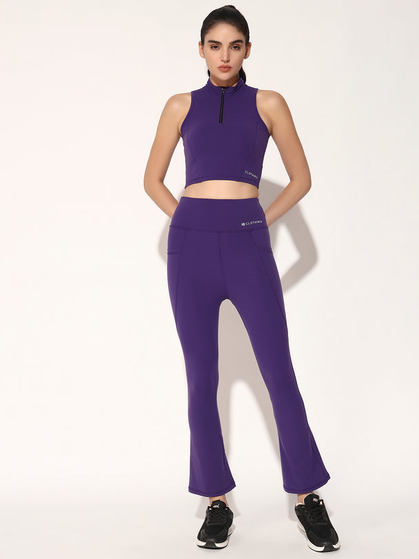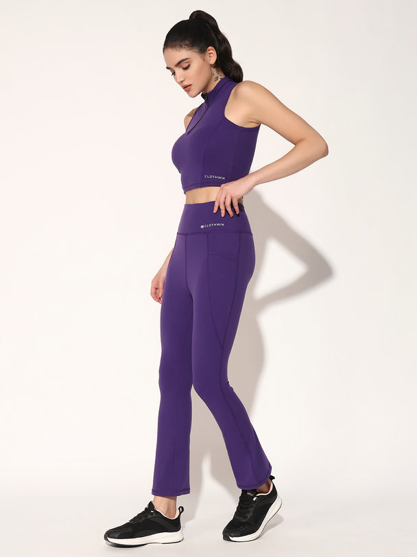 NYLON WOMEN WORKOUT FLARE PANT WITH ZIPED TOP - TRUE PURPLE