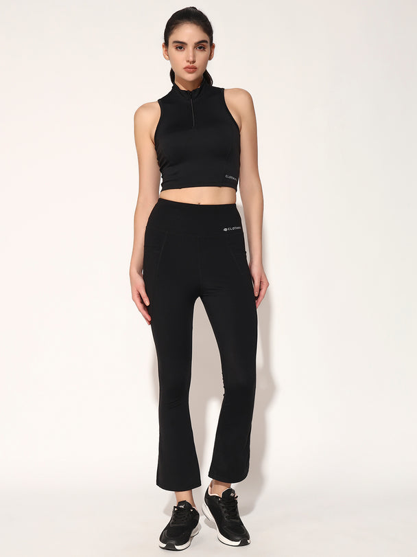 NYLON WOMEN WORKOUT FLARE PANT WITH ZIPED TOP - BLACK
